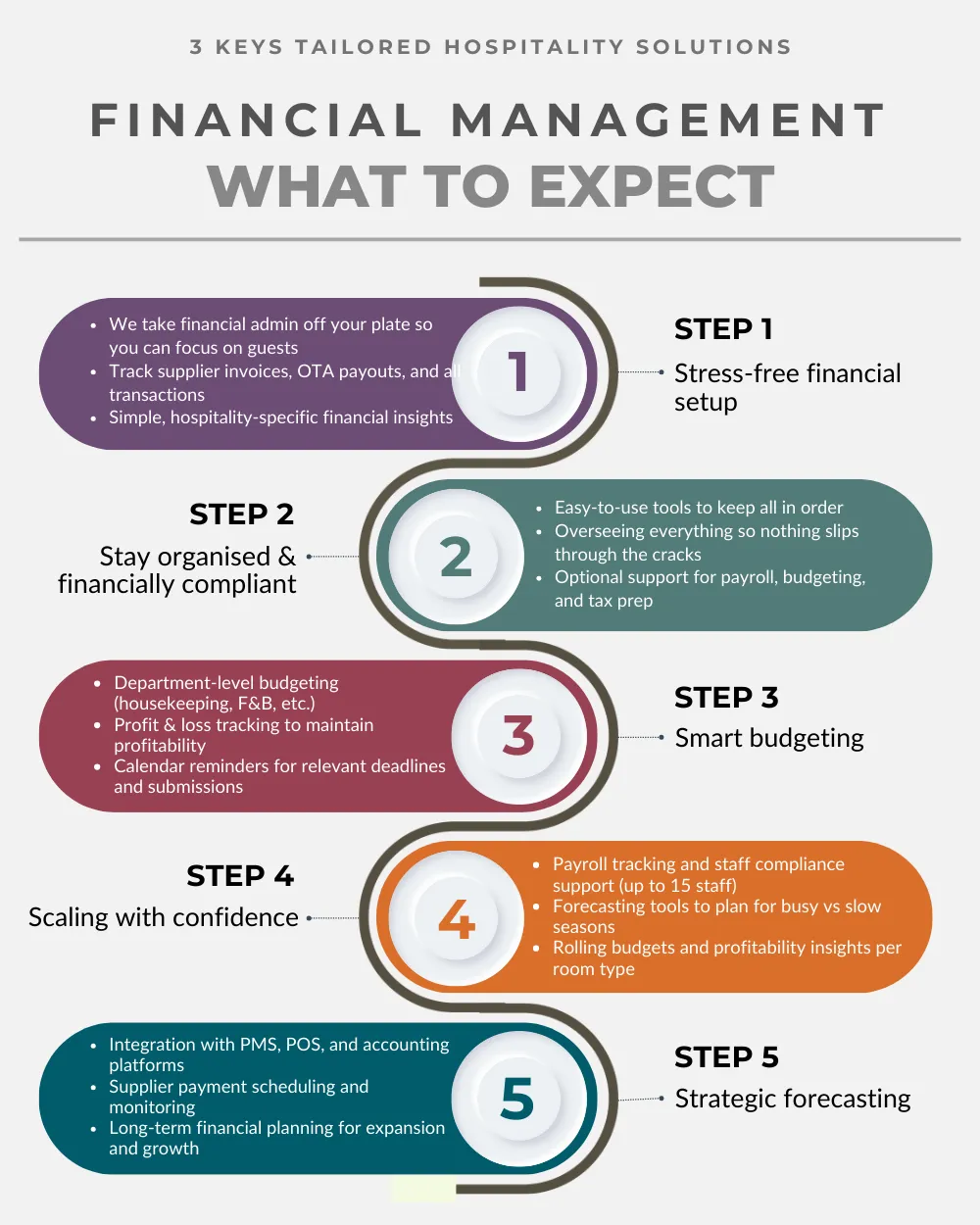 Hospitality finance isn’t like other industries — it’s seasonal, dynamic, and highly operational. You need someone who understands RevPAR, occupancy trends, OTA payment cycles, guest deposits, consumables and linen costs, etc. and how all these affect cash flow. We speak your language — and we make sure your numbers reflect your reality.