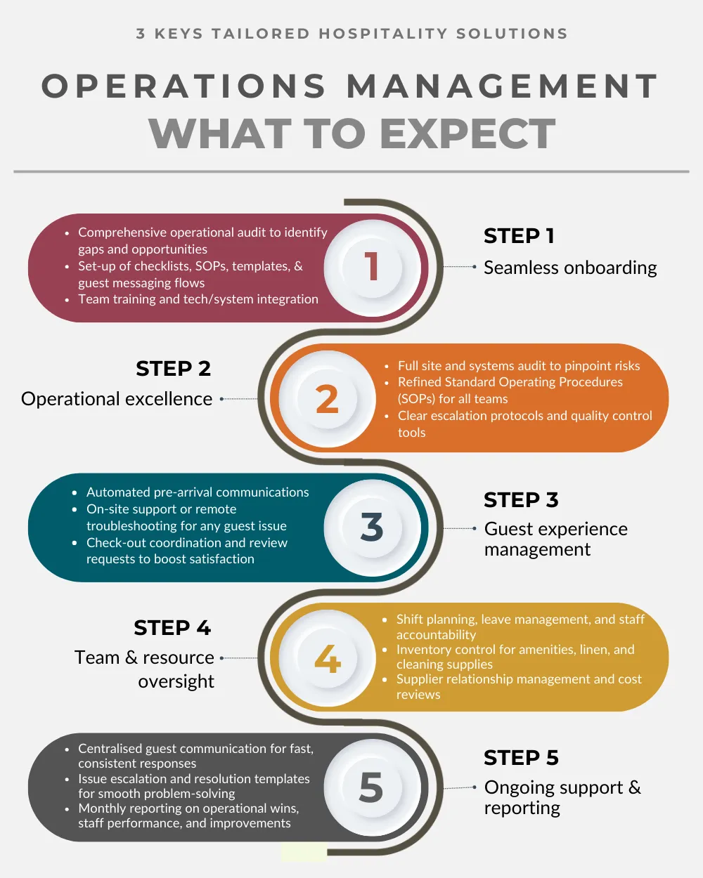 Pre-arrival comms / Welcome messaging / On-site support or remote troubleshooting / Check-out and review requests.